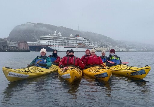 In Ålesund, we decided to try something a bit different and went kayaking through the harbour. It started snowing while we were out on the water, which only made the experience more special. The snow fell quietly as we paddled past the Art Nouveau buildings, it was almost surreal. Finishing off the experience with a brilliant group photo in front of the ship.